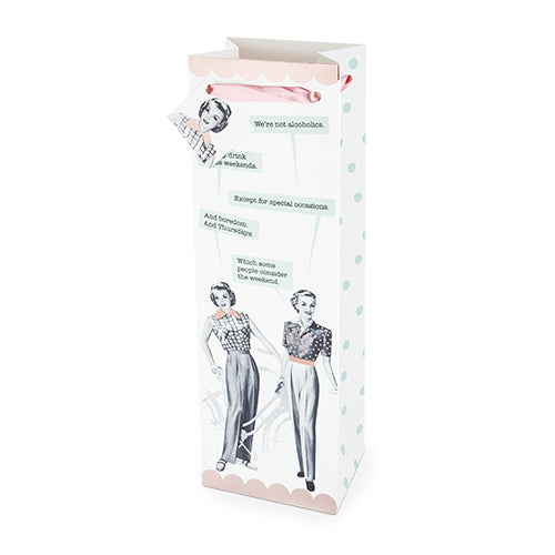 Channel your inner cheek with this retro one-bottle wine bag! The proper fashion of the 1950s is made comical with an equally impudent phrase, adding a touch of humor to an otherwise modest design. Includes pink ribbon handles and matching gift tag.